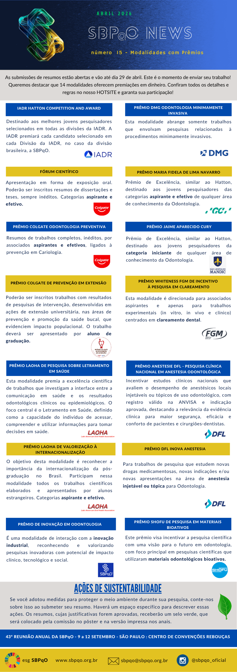 A Sociedade Brasileira de Pesquisa Odontológica - SBPqO é uma Associação sem fins lucrativos, fundada em 05 de maio de 1983. A SBPqO é a Divisão Brasileira da International Association for Dental Research – IADR. Atualmente é a maior divisão na América Latina e uma das mais representativas da IADR no mundo. |
